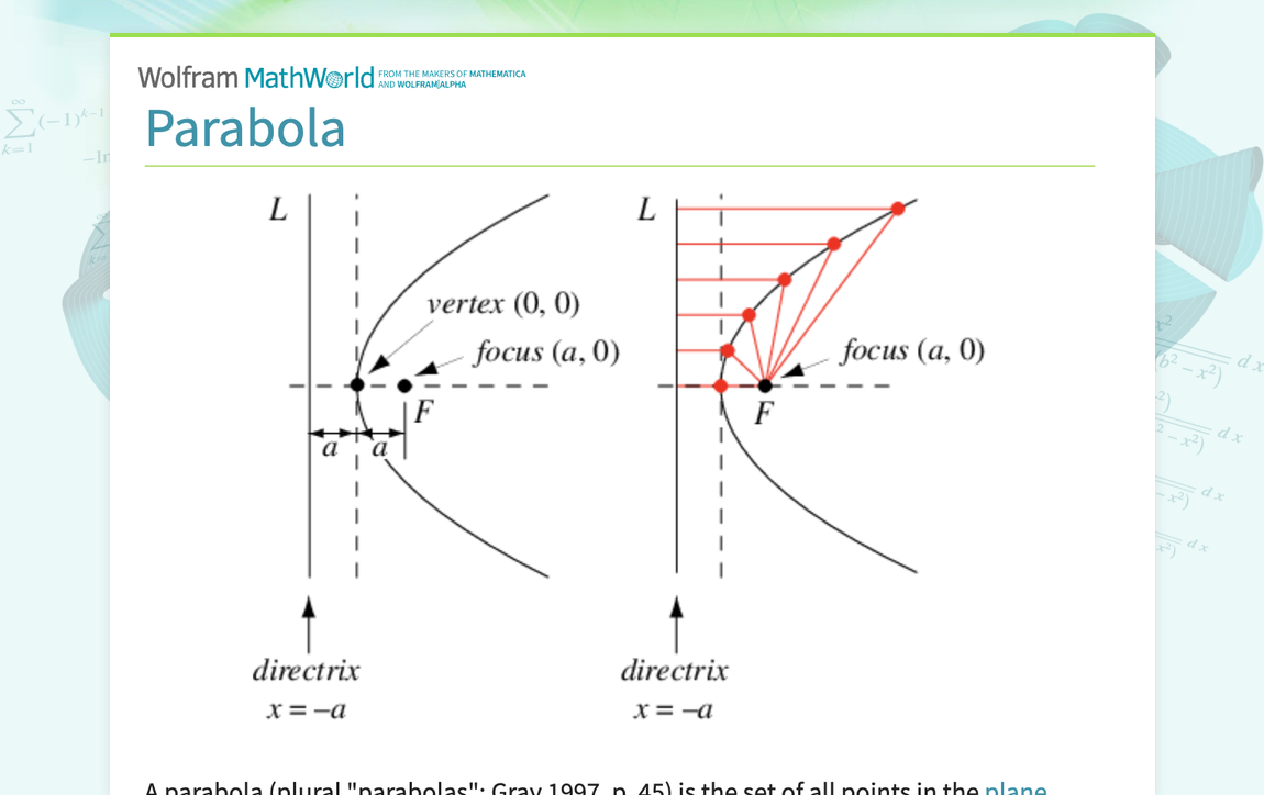 Parabola 是平面内到定点 F(焦点)和定直线 l(准线)距离相等的点的集合。可以用以下公式表达:|PF| = d,其中 |PF| 是点 P 到焦点 F 的距离,d 是点 P 到准线 l 的距离。